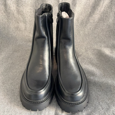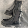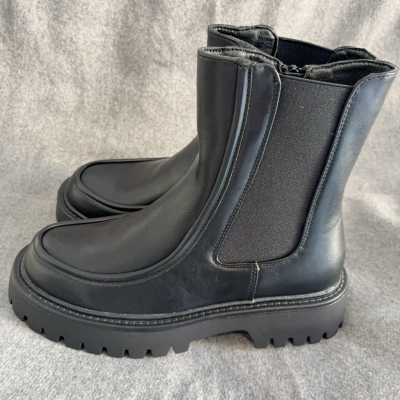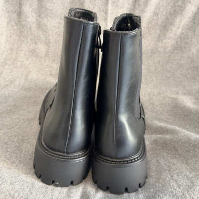 Stivaletti neri in ecopelle liscia, dallo stile moderno e deciso. Dotati di elastici laterali in stile chelsea e zip interna per una calzata pratica. La suola carrarmato spessa garantisce stabilità e un ottimo grip, ideale per le giornate fredde o piovose. Design minimal ma grintoso, facile da abbinare a qualsiasi outfit.