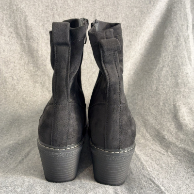 Stivaletti da donna in morbido camoscio nero con suola a zeppa, ideali per un look casual e confortevole durante la stagione fredda. Dotati di pratica chiusura laterale con zip per una calzata facile. La zeppa dona altezza senza rinunciare alla comodità, mentre la suola dentellata assicura stabilità e grip.