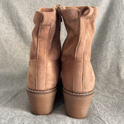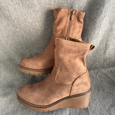 Stivaletti da donna in morbido camoscio color cuoio, perfetti per un look caldo e naturale. Dotati di zip laterale per una calzata pratica e veloce. La zeppa media offre altezza e comodità, ideale per un uso quotidiano durante la stagione autunnale e invernale. La suola dentellata garantisce stabilità e comfort.