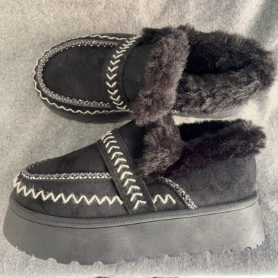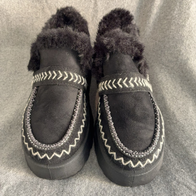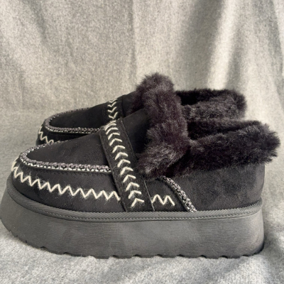 Comodissimi mocassini invernali da donna, realizzati in materiale effetto camoscio nero e rifiniti con cuciture decorative a contrasto. L’interno è completamente foderato in morbida pelliccia sintetica, ideale per mantenere il piede caldo anche nelle giornate più fredde